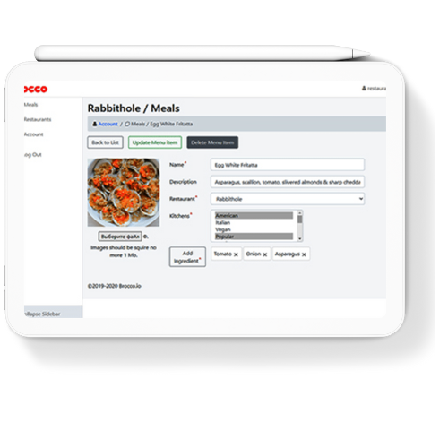 The online delivery providers sell via the Brocco Delivery Marketplace via an easy-to-use dashboard. As a provider, Log in to the Restaurant Portal to view your items across all your locations to manage your meal items and more. You can edit your menu and upload meal photos to increase customer engagement.